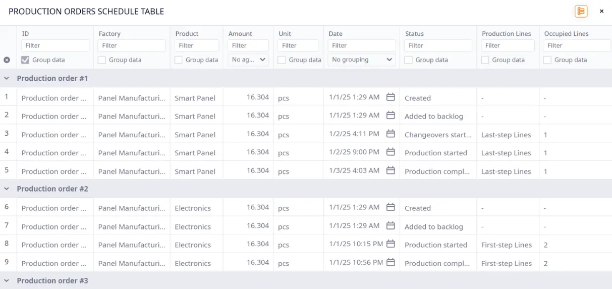 • Production orders: a detailed overview of all orders. It captures all relevant parameters from factory and line assignments to timing, costs, and CO₂ impact.
