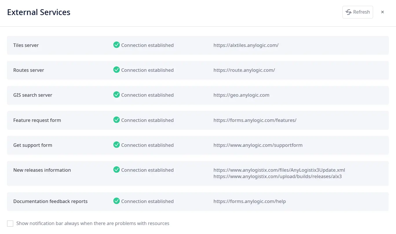 To make troubleshooting easier, anyLogistix 3.4.1 introduces a new External services availability panel. It is a simple yet powerful dashboard that shows the connection status to all essential anyLogistix online services.