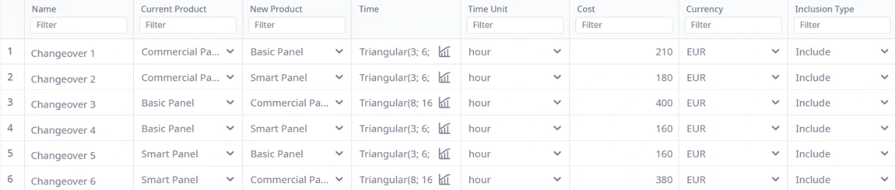 • Changeovers: specify the time and cost of switching production from one product type to another.