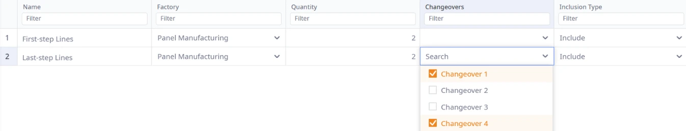 Changeovers themselves are defined in a new dedicated Production changeovers table, allowing you to specify: