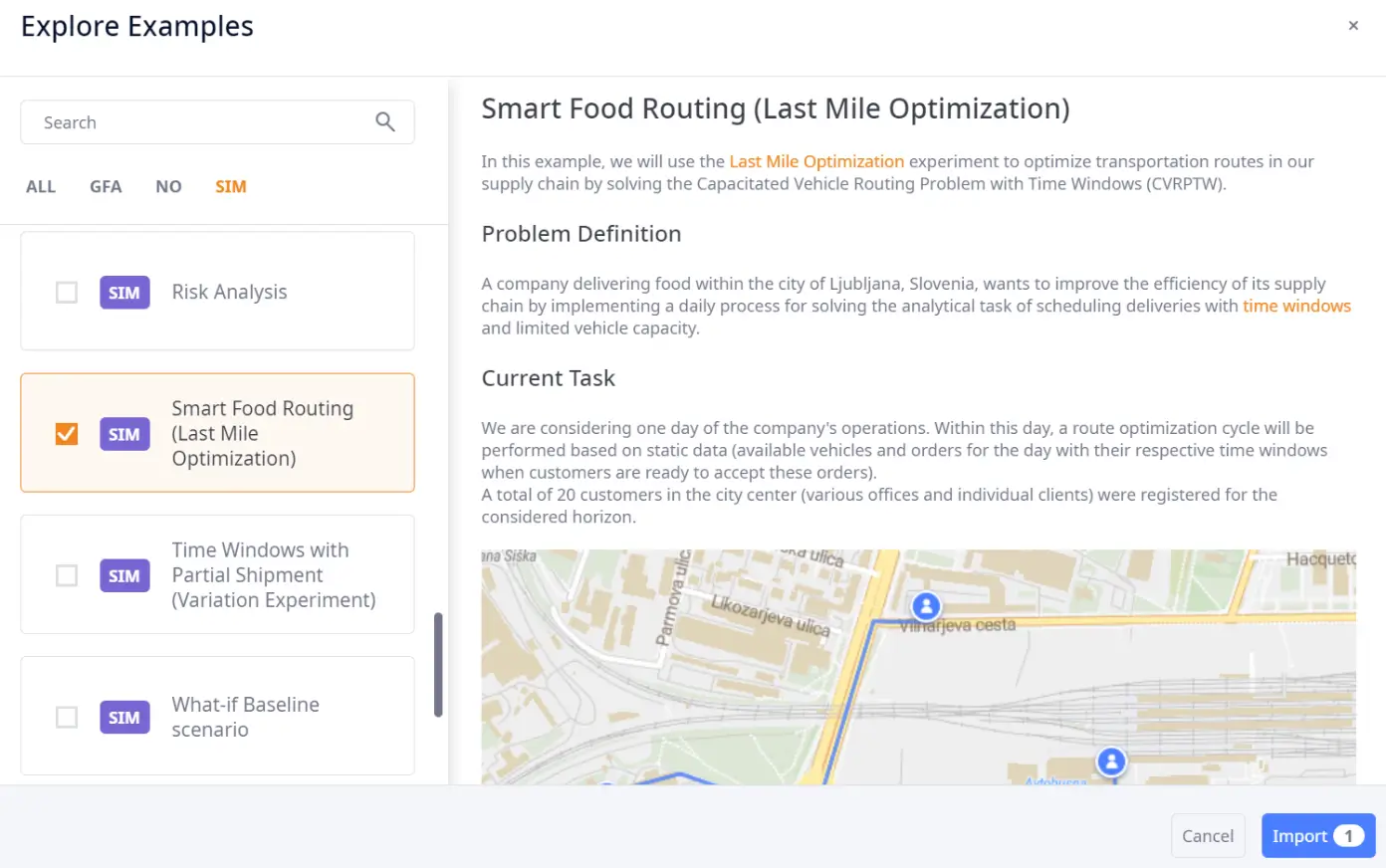 Importing the last-mile optimization example to your project in anyLogistix (click to enlarge)