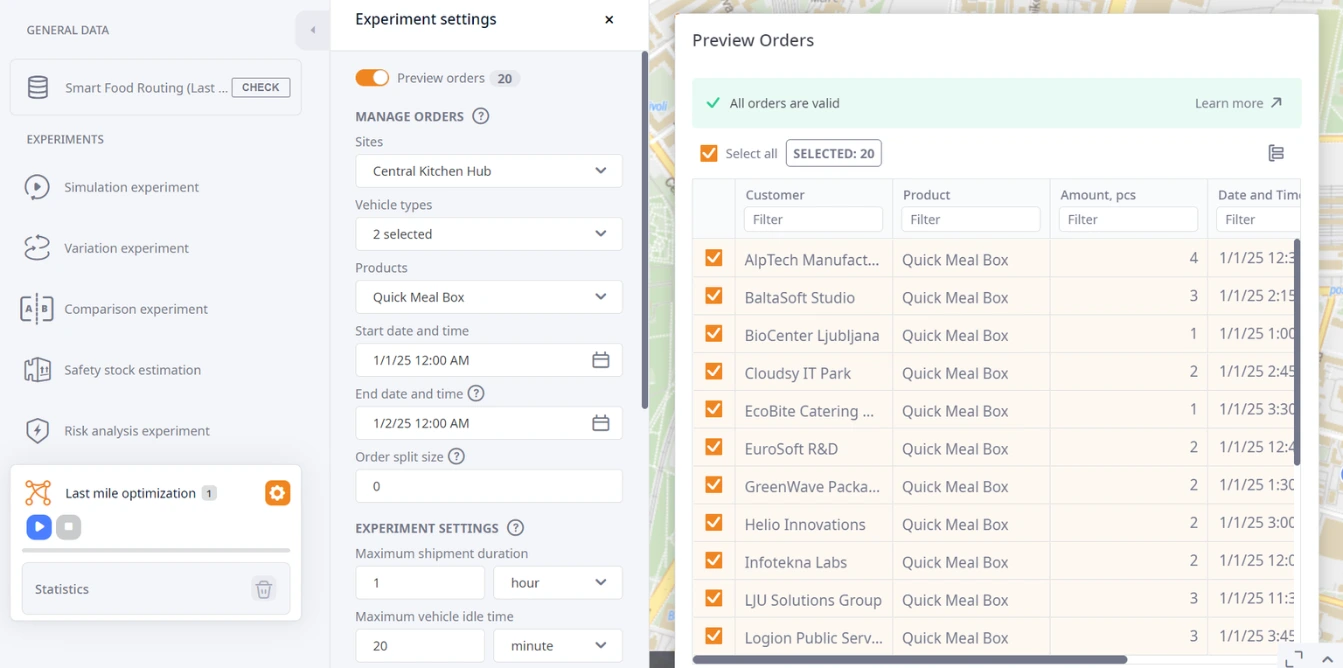 This is how you can set up, run, and analyze a last-mile optimization experiment in anyLogistix to transform complex food delivery challenges into efficient and reliable operations.