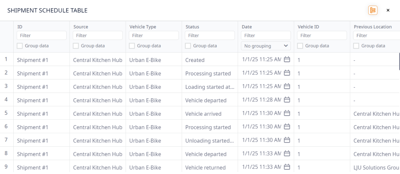 • Shipments schedule table: Provides a detailed breakdown of every shipment, including courier arrival times at each location, unloading times and durations, and any delays or idle periods encountered.